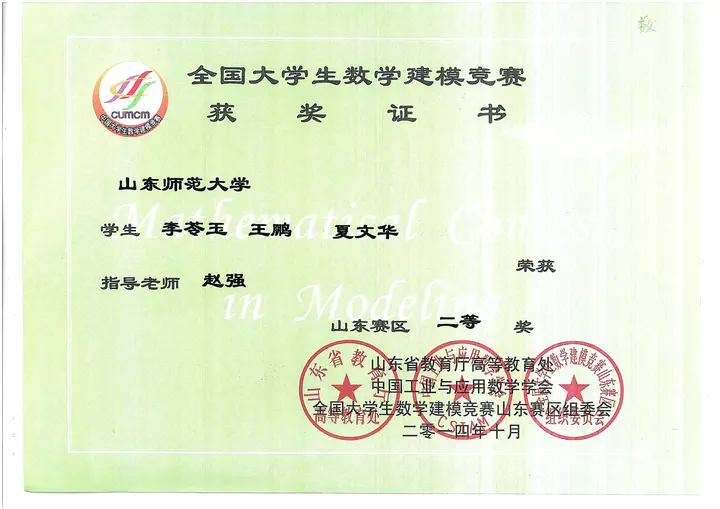 Contemporary Undergraduate Mathematical Contest in Modeling (CUMCM), Second Prize, Shandong Division