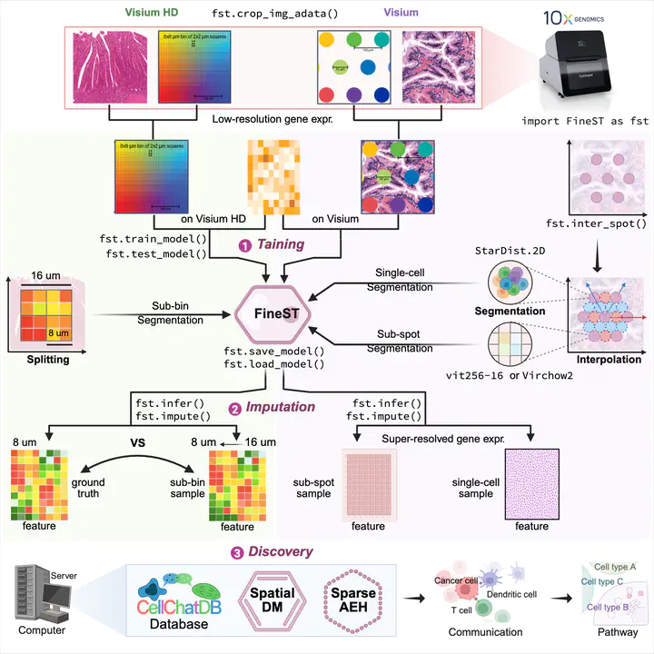 Spatial transcriptomics (ST) has emerged as a powerful tool for analyzing cell-cell communication (CCC) across various biological processes, ranging from embryonic development to cancer progression. However, its limited resolution and high data sparsity hinder the detailed characterization of CCC patterns within complex tissues. Here, we introduce FineST, a deep contrastive learning model that leverages a histology foundation model to fuse ST and histology images, enabling Fine-grained Spatial Transcriptomics analysis. This approach facilitates precise nuclei segmentation, high-resolution RNA expression imputation, and the identification of intricate ligand-receptor interactions. Using both colorectal cancer VisiumHD and breast cancer Xenium datasets, we demonstrate that FineST significantly outperforms existing methods in high-resolution RNA imputation, cell type prediction, and CCC pattern discovery. With focused application to the Visium platform, FineST reveals novel biological insights into tumor-immune interactions across multiple cancer types, including invasive fronts in breast cancer, tertiary lymphoid structures in nasopharyngeal carcinoma, and PD-1 therapy resistance barriers in hepatocellular carcinoma. These findings highlight a new paradigm in ST analysis through the integration of readily available histology images.