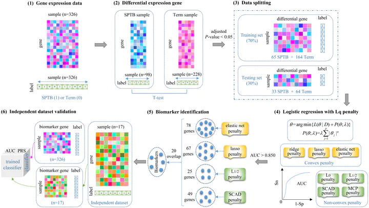 In this work, we provide a computational method of regularized logistic regression for discovering biomarkers of spontaneous preterm birth (SPTB) from gene expression data. The successful identification of SPTB biomarkers will greatly benefit the interference of infant gestational age for reducing the risks of pregnant women and preemies. In recent years, various approaches have been proposed for the feature selection of identifying the subset of meaningful genes that can achieve accurate classification for disease samples from controls. Here, we comprehensively summarize the regularized logistic regression with seven effective penalties developed for the selection of strongly indicative genes of SPTB from microarray data. We compare their properties and assess their classification performances in multiple datasets. It shows that elastic net, lasso, $L_{1/2}$ and SCAD penalties get the better performance than others and can be successfully used to identify biomarkers of SPTB. Particularly, we make a functional enrichment analysis on these biomarkers and construct a logistic regression classifier based on them. The classifier generates an indicator of preterm risk score (PRS) for predicting SPTB. Based on the trained predictor, we verify the identified biomarkers on an independent dataset. The biomarkers achieve the AUC value of 0.933 in the SPTB classification. The results demonstrate the effectiveness and efficiency of the built-up strategy of biomarker discovery with regularized logistic regression. Obviously, the proposed method of discovering biomarkers for SPTB can be easily extended for other complex diseases.